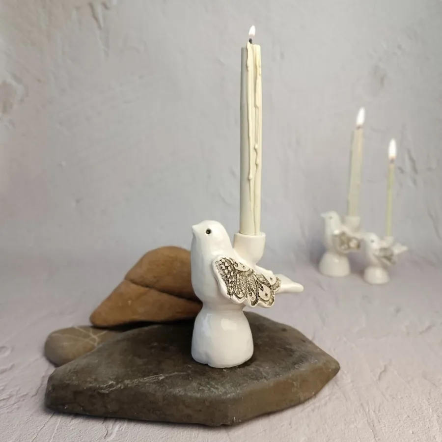 Додайте тепла та символізму вашому дому. Ці авторські підсвічники у формі птахів виконані у техніці ручного ліплення, що робить кожен виріб унікальним. Делікатний білий глянець у поєднанні з фактурним візерунком на крилах та золотистими акцентами створює атмосферу спокою та гармонії.