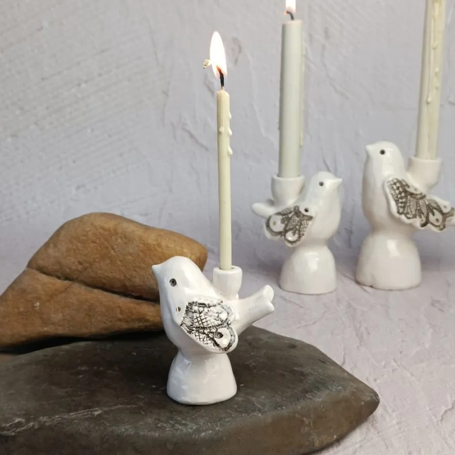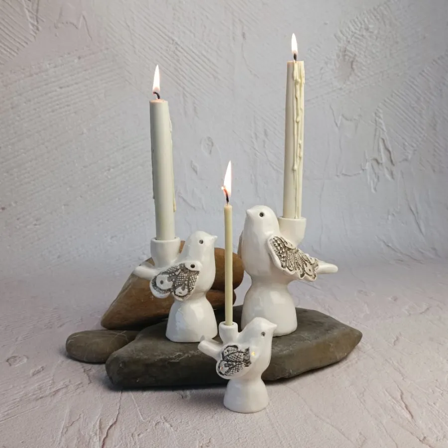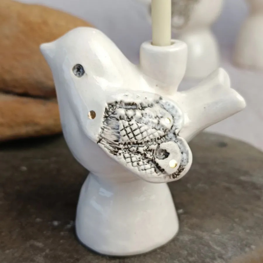 Додайте тепла та символізму вашому дому. Ці авторські підсвічники у формі птахів виконані у техніці ручного ліплення, що робить кожен виріб унікальним. Делікатний білий глянець у поєднанні з фактурним візерунком на крилах та золотистими акцентами створює атмосферу спокою та гармонії.