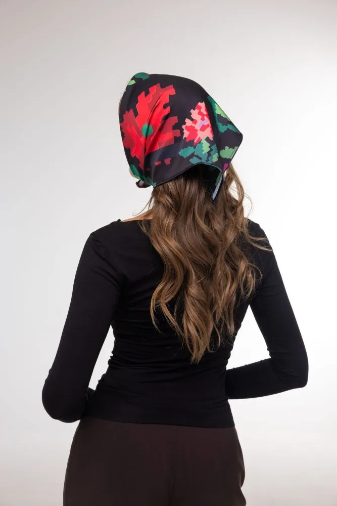 На хустці відтворено орнамент Буковинського килиму з ружами. Піксельна техніка малюнку чудово підкреслює специфіку ткацького почерку килиму.