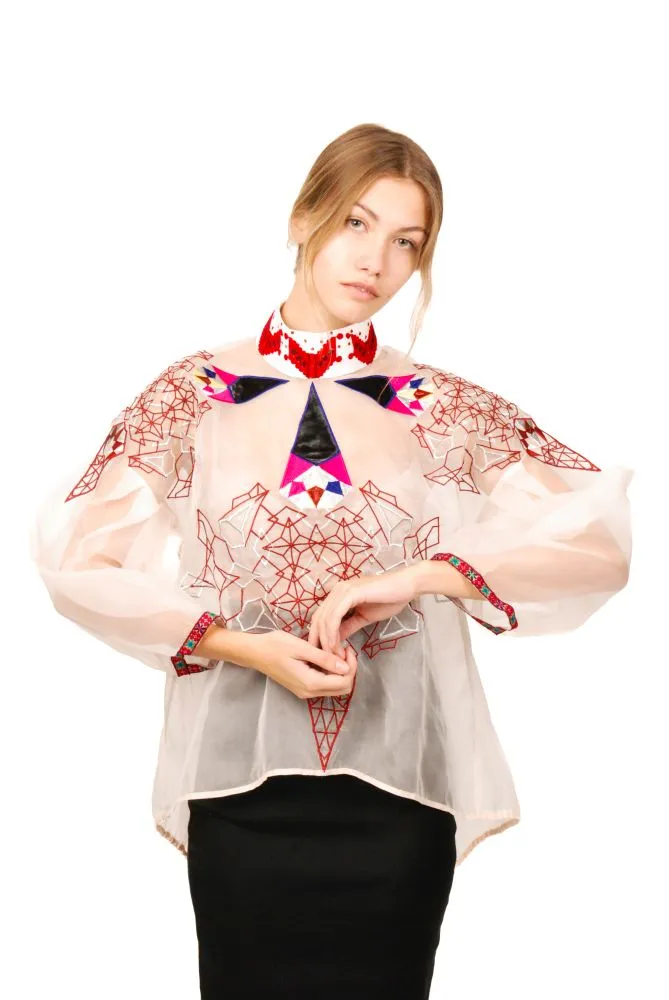 Прозора вишита блуза з шовкової органзи зі зборами на спині. Вільний крій. Аплікація, прикрашена зірковим кристалом (червоно-білим), створює гарну трикутну форму на декольте.