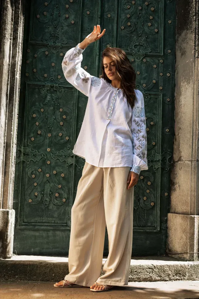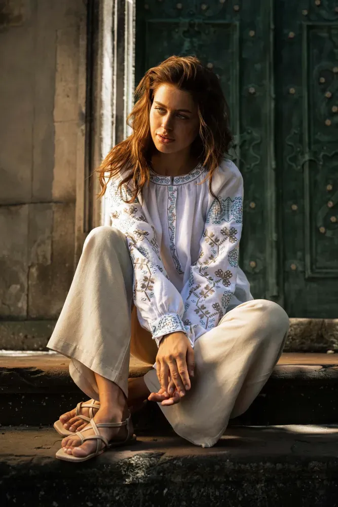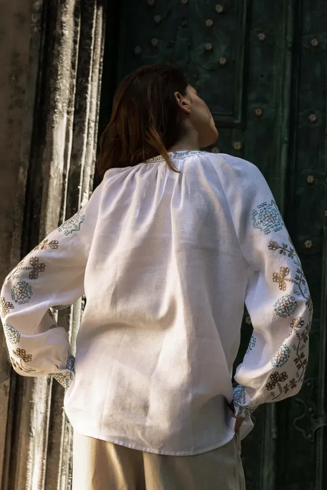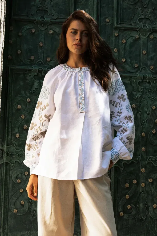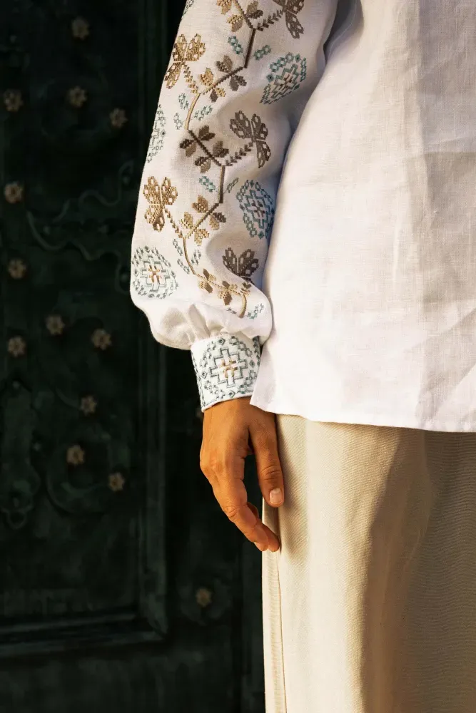 Візерунок створено машинною вишивкою з імітацією ручних технік вишиття.