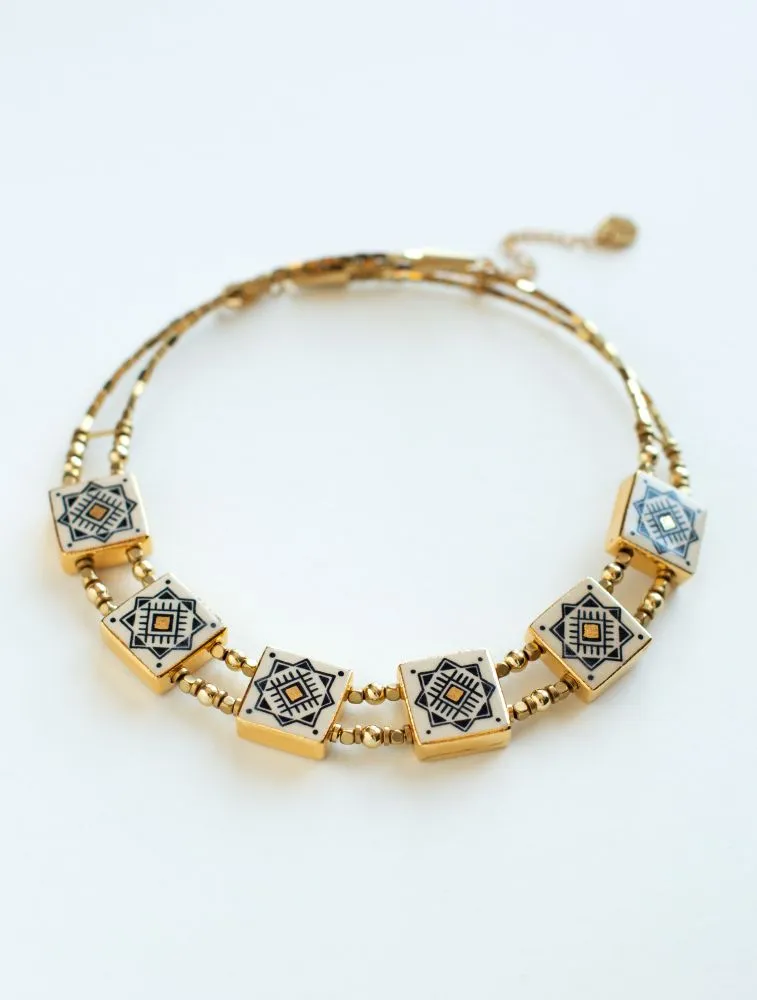 Золоте тло додає тепла й шляхетності, а контрастний розпис підкреслює характер прикраси — стриманий, впевнений, сучасний. Цей чокер — для жінки, яка любить структуру, символи й зміст. Для тієї, що носить не просто прикрасу, а знак внутрішнього світла.