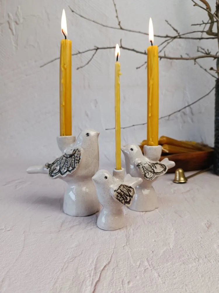 Тендітні пташки створені, щоб приносити спокій у ваш дім. Сіра глина з делікатним крапчастим ефектом та деталізований розпис крил роблять кожного птаха унікальним. Коли свічка горить, здається, що птах оберігає ваше тепле вогнище. Ідеально підходять для тонких та товстих воскових свічок.