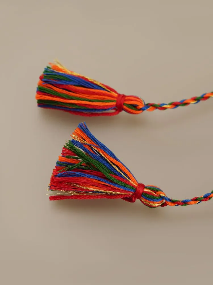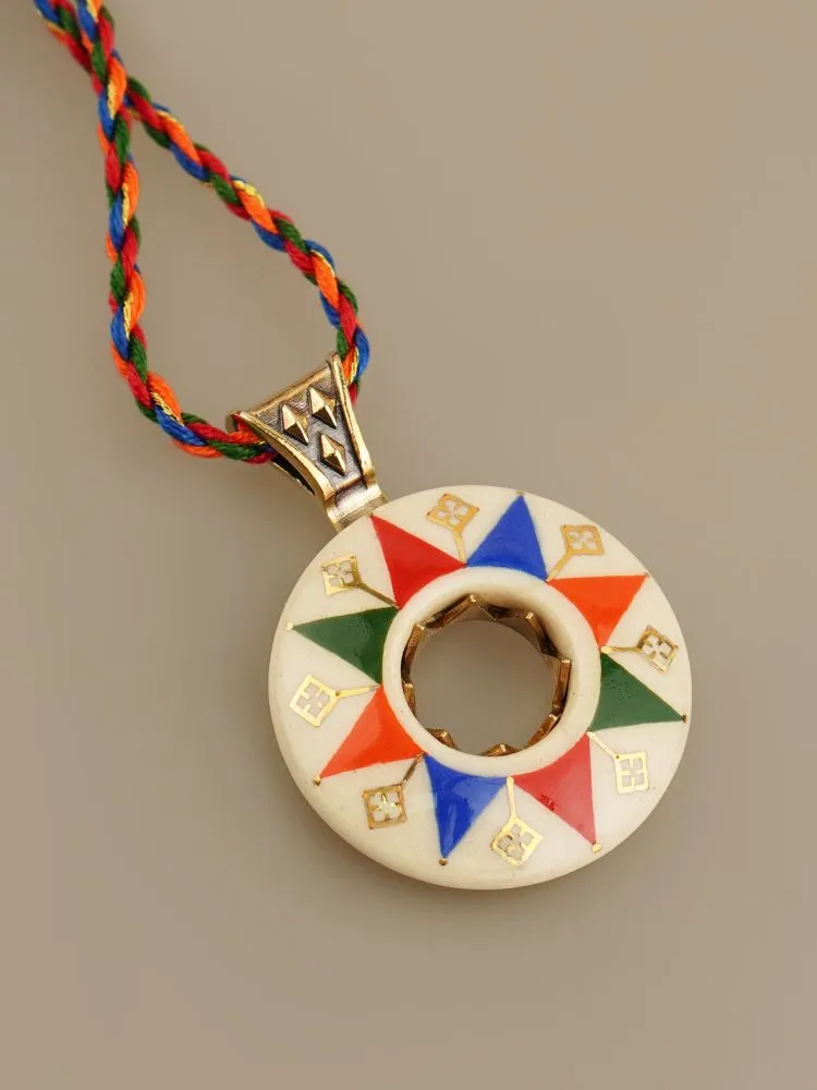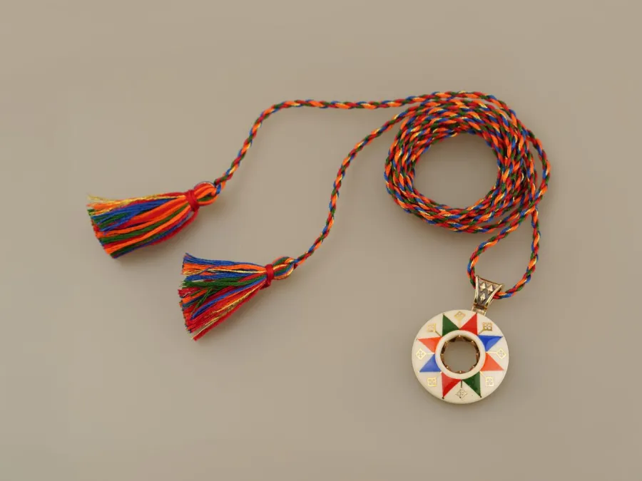 Авторська розписана намистина ручної роботи з білої глини, покрита поливою і оздоблена рідким золотом (вміст золота - 12%); фурнітура - литво латунь. Плетені вручну кутасики та стрічка довжиною 160 см