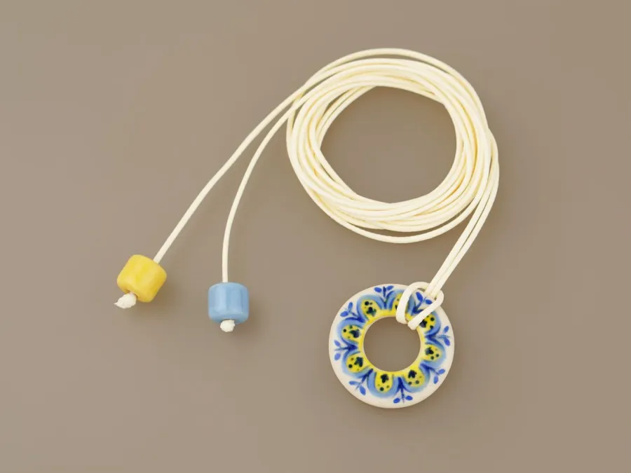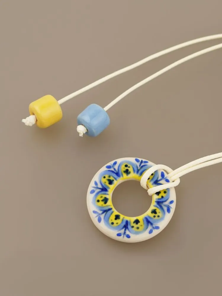 Кулон з авторським розписом «Обрій» та намистини ручної роботи з білої глини, покриті поливою. Бавовняний воскований шнур довжиною 170 см.