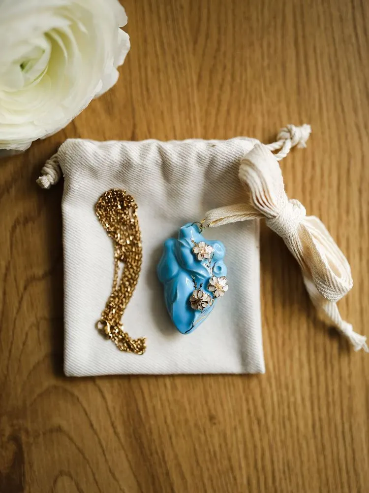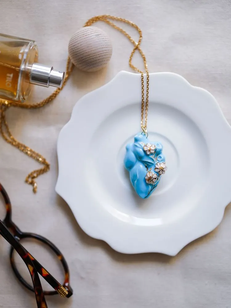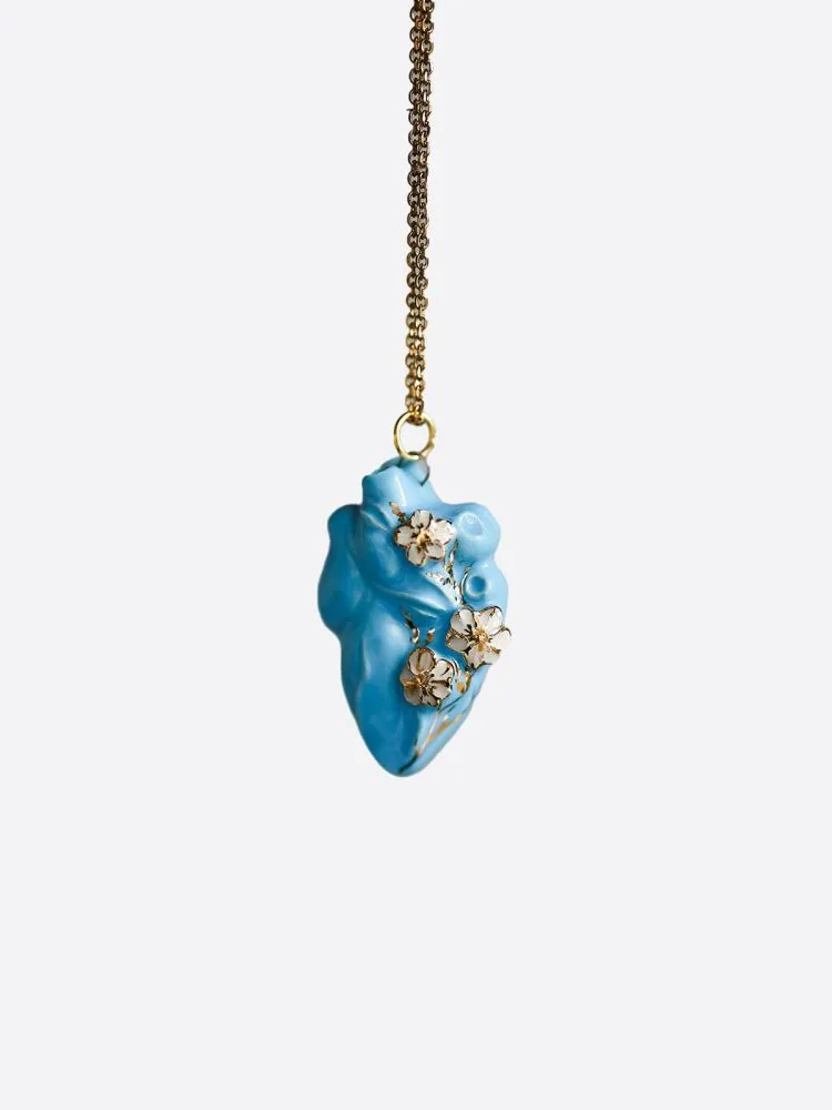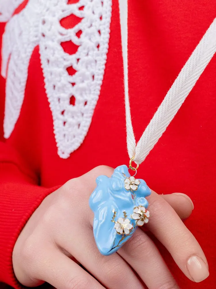 Керамічна прикраса підвіска Серце з покриттям глянцевої блакитної поливи. Вручну декорована квітами й гілочками, розписаними справжнім золотом.