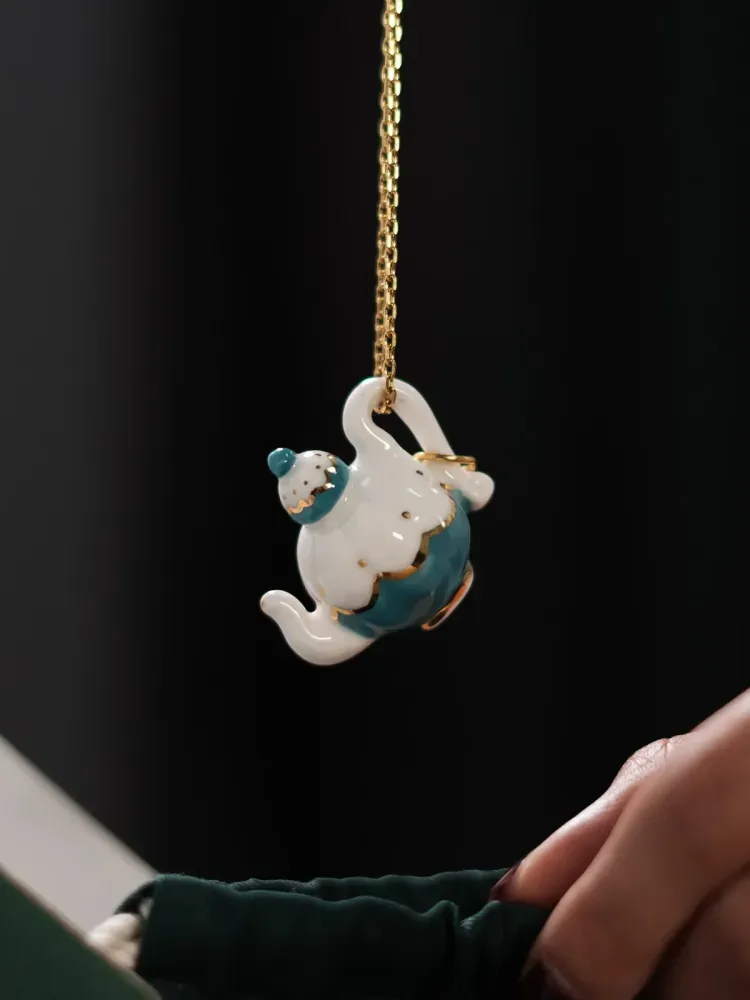 Ця порцелянова підвіска – ніби сцена з чарівного сну. Маленький порцеляновий чайничок із ніжною бірюзою та золотими акцентами нагадує про світ, де час зупиняється за чашкою чаю, а буденність наповнюється дивом. Його округлі форми створюють відчуття затишку, тепла та гри. Кожна деталь – від ручки до кришечки – виліплена вручну, щоб зберегти дух старовинної казки.