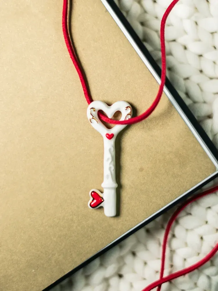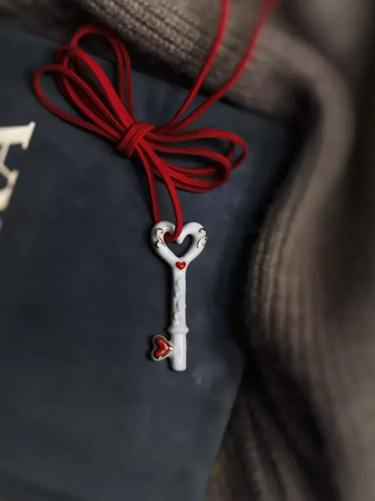 Білий порцеляновий ключ із ніжними завитками, створеними справжнім золотом і двома червоними серцями – у центрі та на кінці. Він створений, щоб відкривати двері до дивовижного світу почуттів. Лінії плавні, а покриття блискуче, немов зіткане з мрії. Тонкий червоний шнур додає контрасту й тепла, мов енергія життя, що проходить крізь білу чистоту порцеляни.