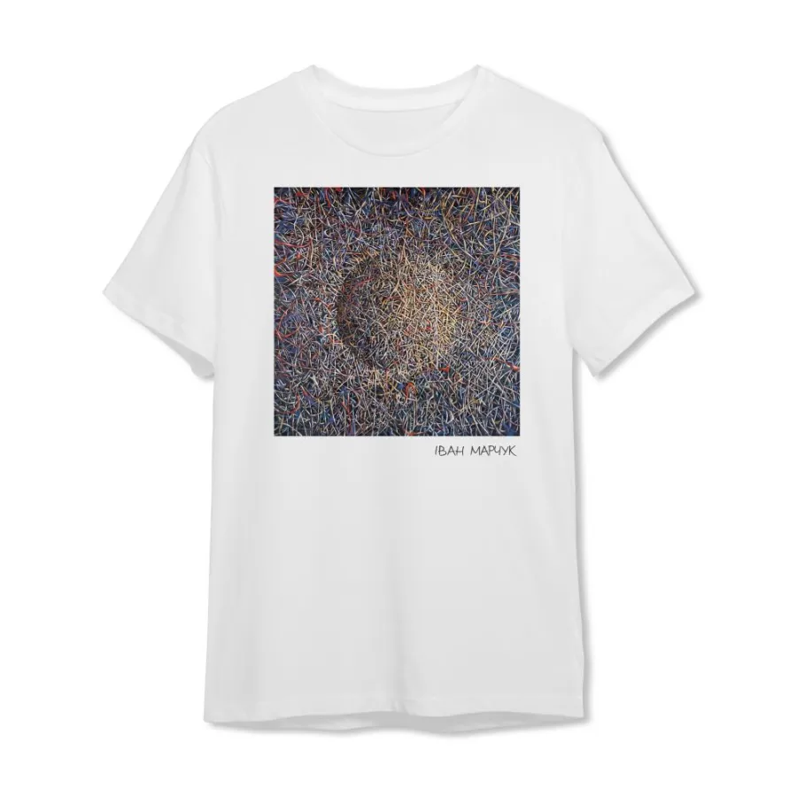 Футболка вийшла у колаборації із зіркою українського мистецтва Іваном Марчуком. Вона має оверсайз крій, короткі рукави та круглий виріз, оздоблений резинкою.