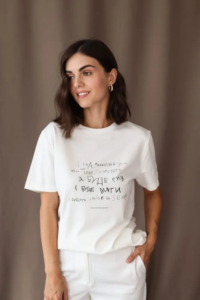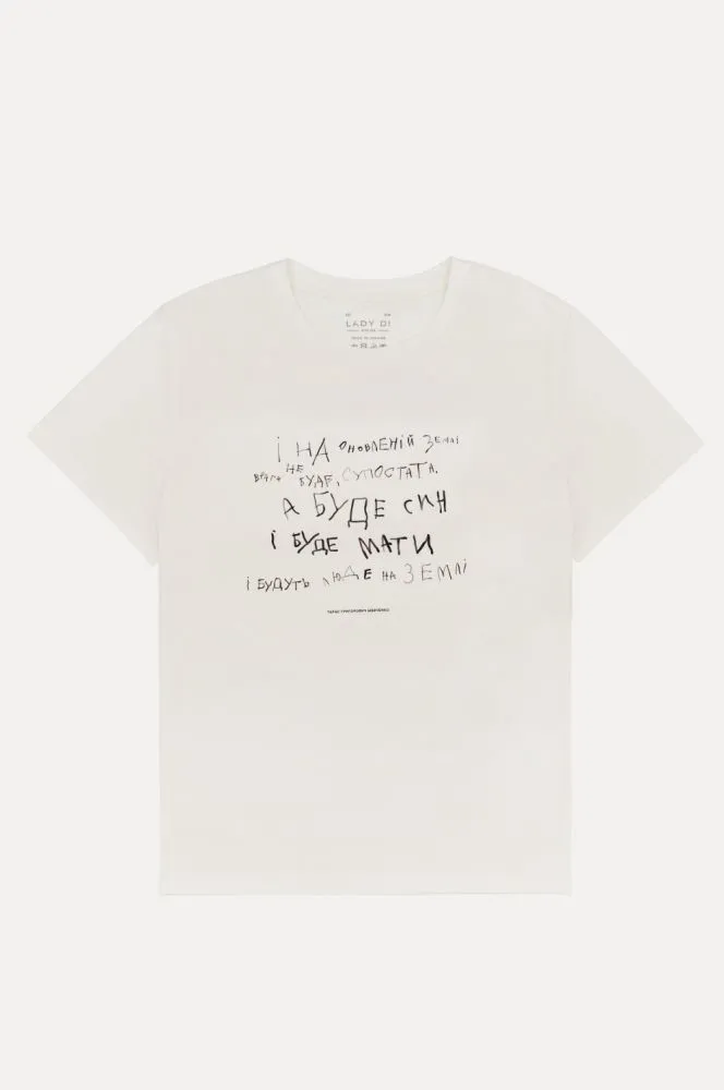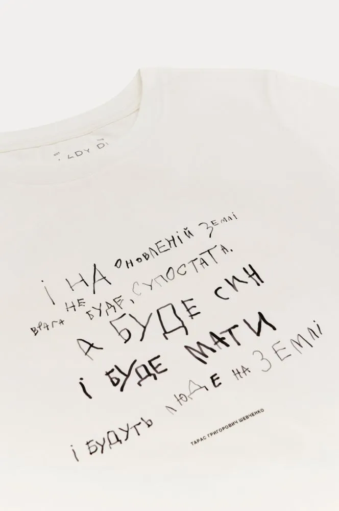 Патріотична футболка вільного крою з уривком вірша Тараса Григоровича Шевченка як символ відданості до рідної Батьківщини. Букви намалював маленький хлопчик, який лише вчиться писати.