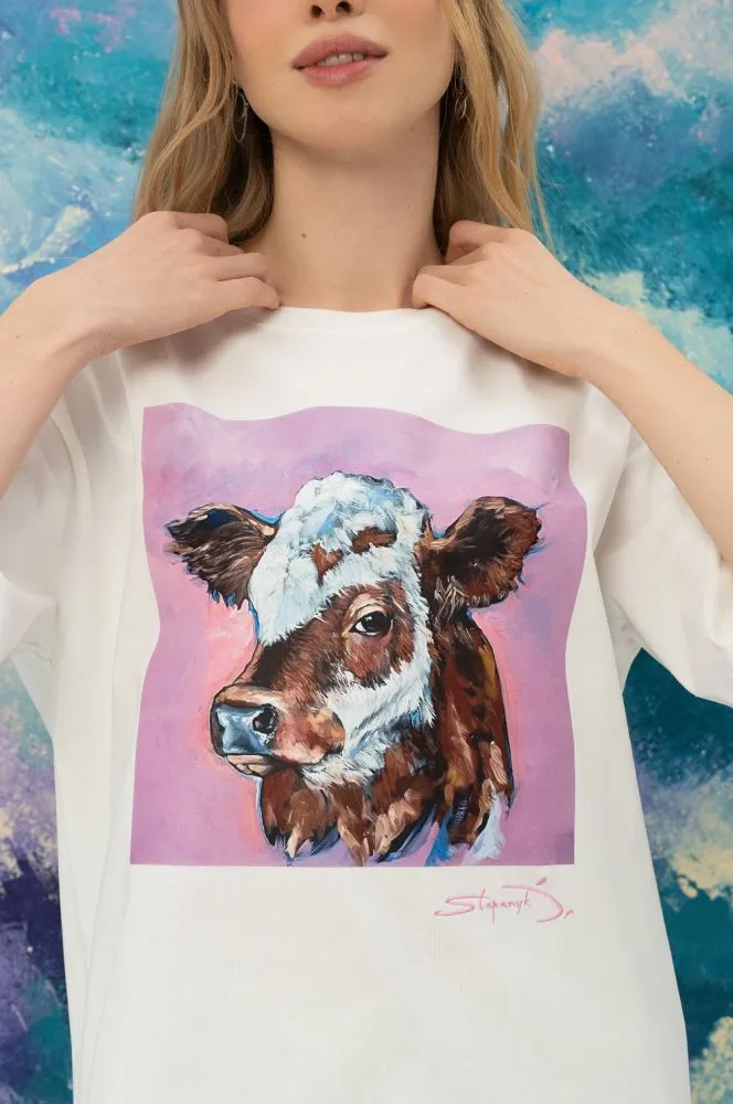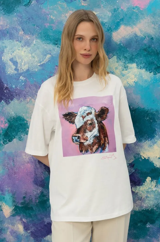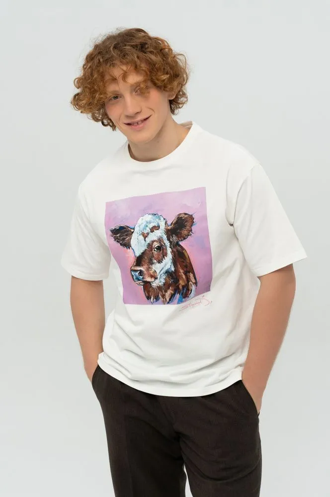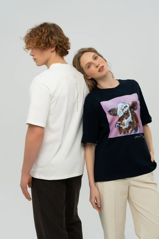 Образ корови як символу родинної опори, достатку та спокою перенесено з живопису у формат щоденного одягу. Картина Ігоря Степаника «Рожева любов» у цій інтерпретації звучить сучасно й стримано — без пафосу, але з глибиною.