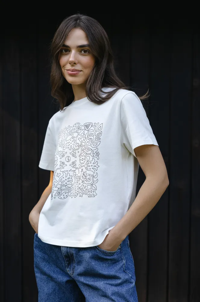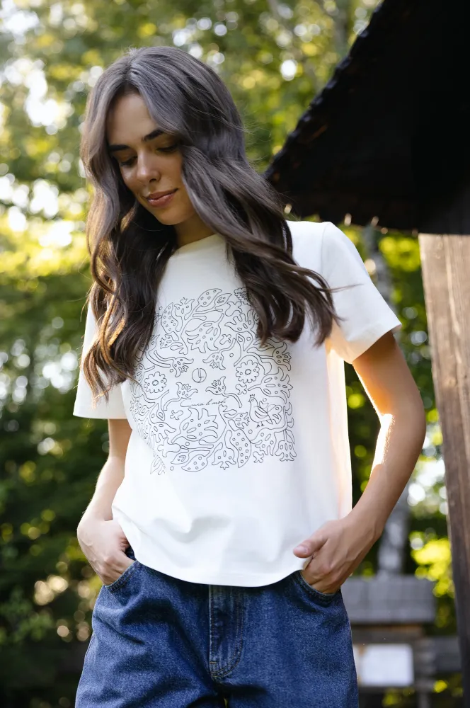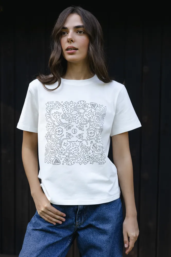 Вибійка - стародавня техніка створення орнаментів на тканині за допомогою різьблених форм. Кожен взор — ручна робота: від створення форми для штампу до нанесення орнаменту на тканину. Тут це рослинні орнаменти, нейтральні кольори.