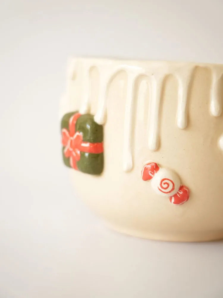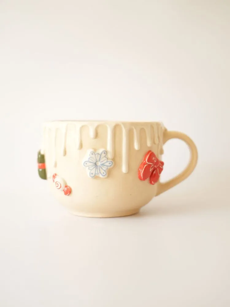 Немов святковий десерт, це горнятко прикрашене об’ємними деталями – шоколадкою, цукерками, сніжинками та яскравим бантом. Верхівка ніби вкрита солодкою білою глазур’ю, що стікає апетитними краплями.