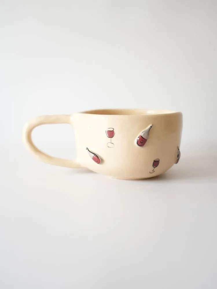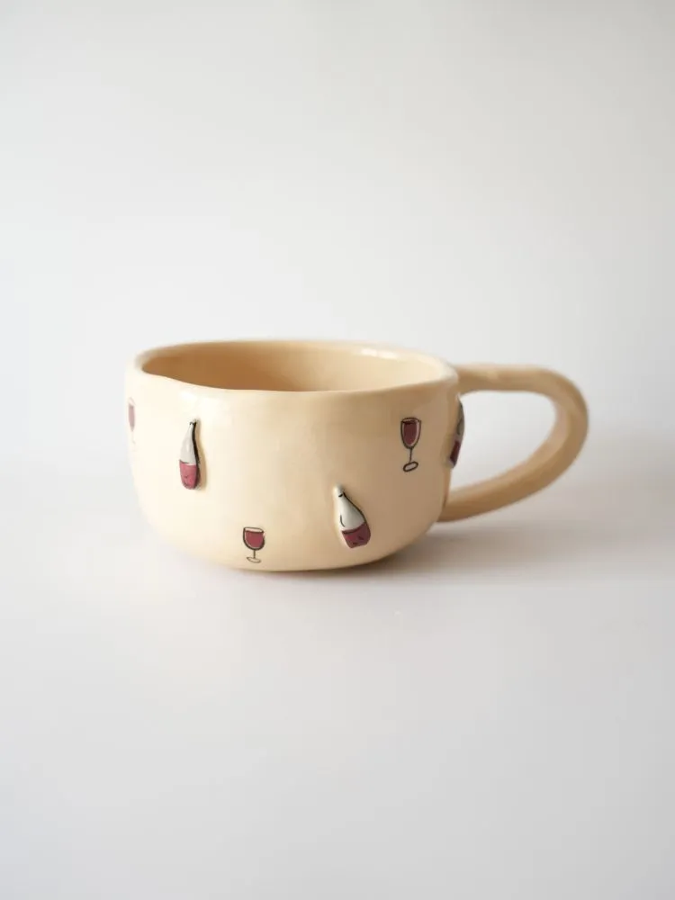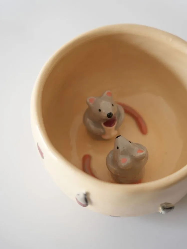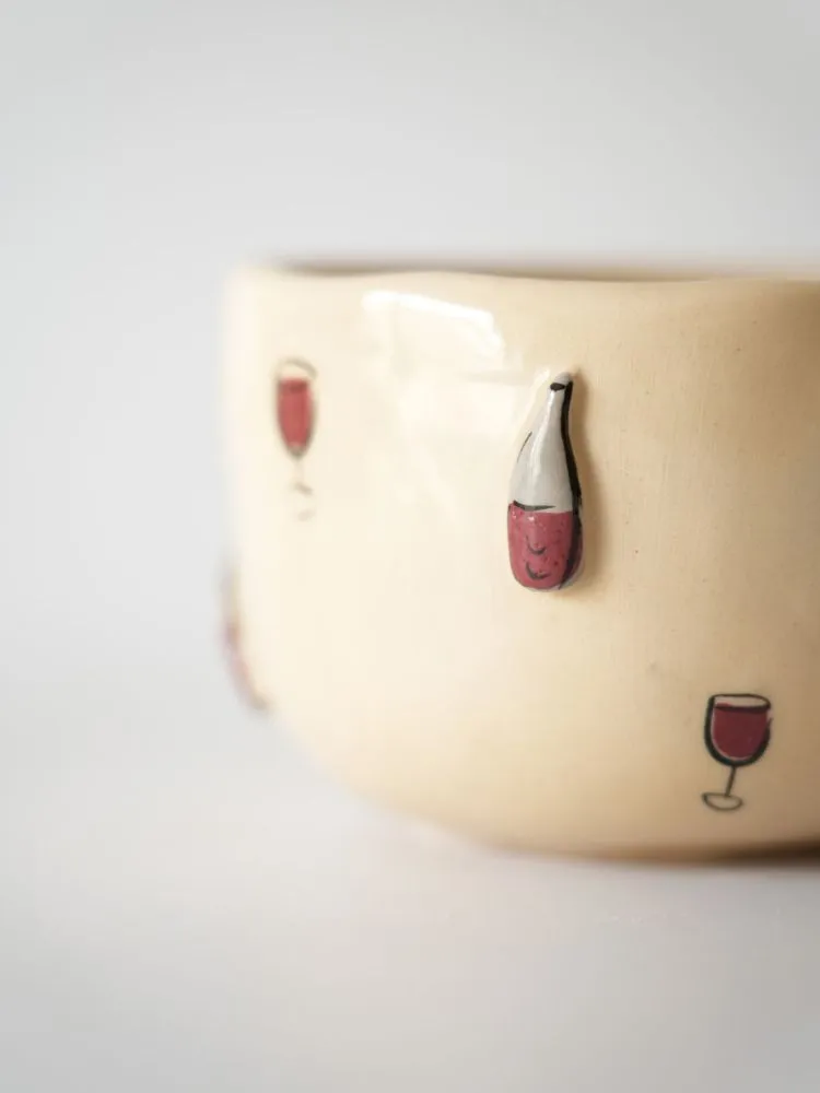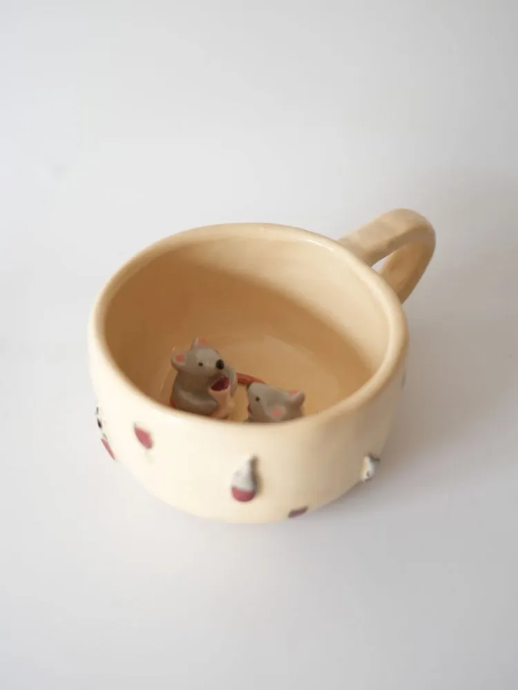 Усередині цього горнятка двоє милих щуриків насолоджуються келихом вина — як символ теплих розмов і гарного настрою. Кожна деталь виліплена вручну, а зовнішня поверхня прикрашена об’ємними пляшечками й келихами.