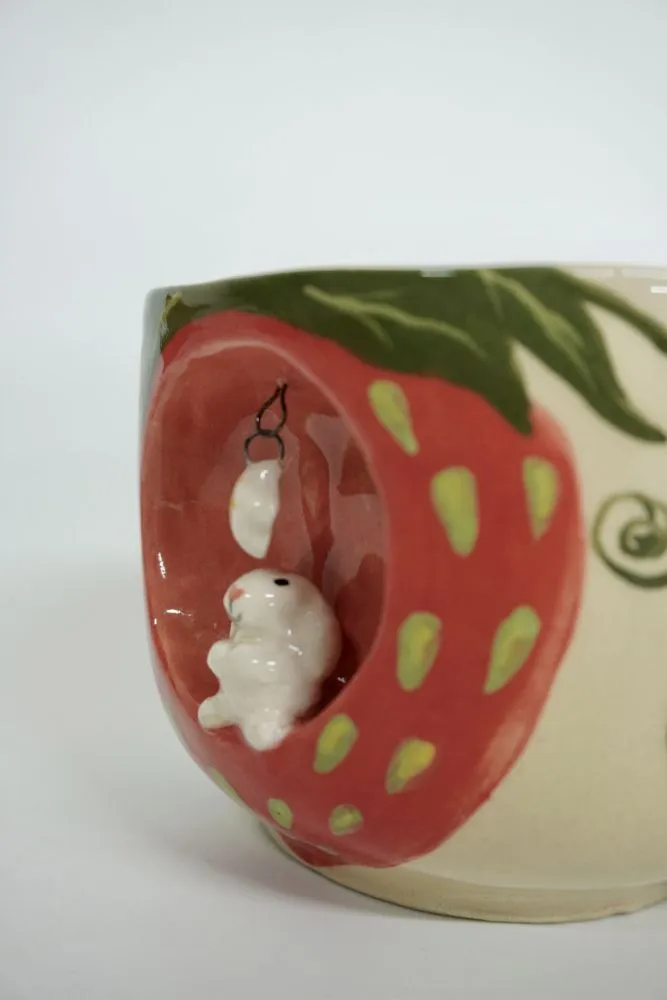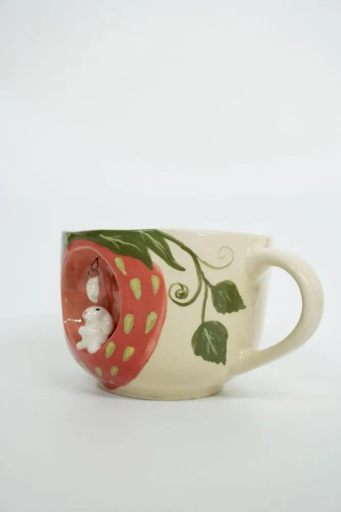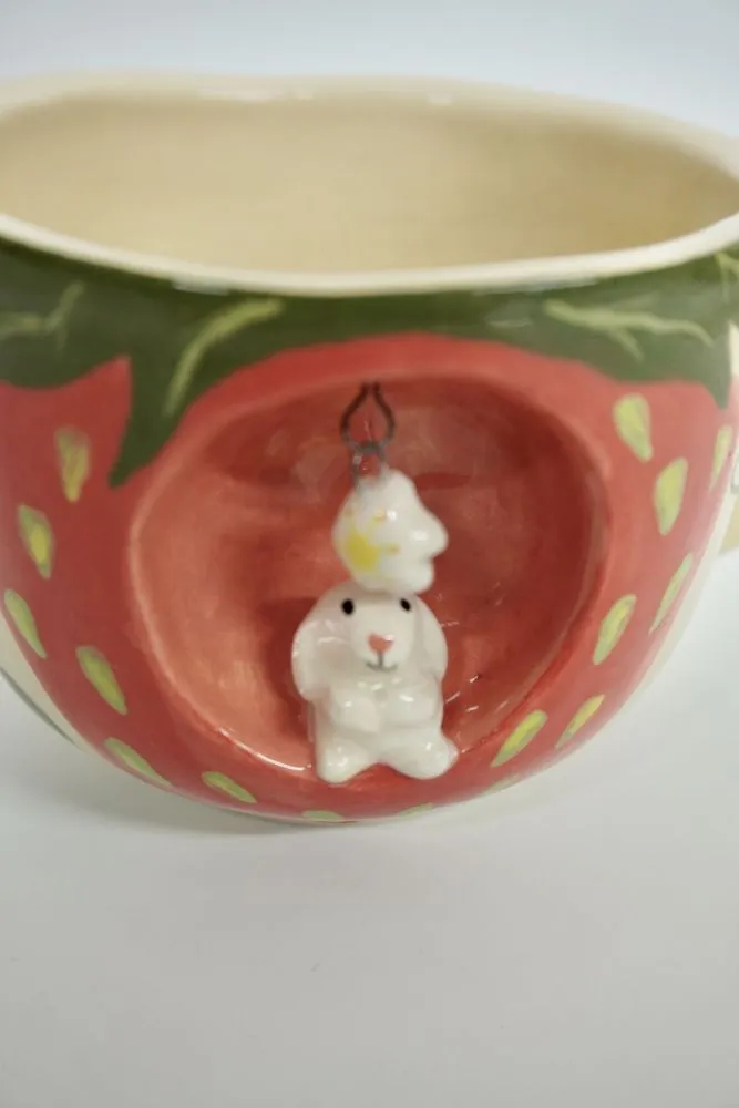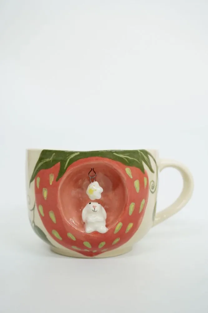 Зайчик і полуниця ліпляться та розписуються вручну, з увагою до яскравих кольорів і деталей. Кожне горнятко виглядає як маленька історія — тепла, кумедна й дуже затишна.