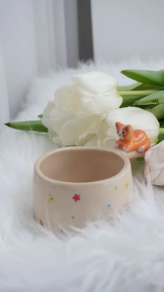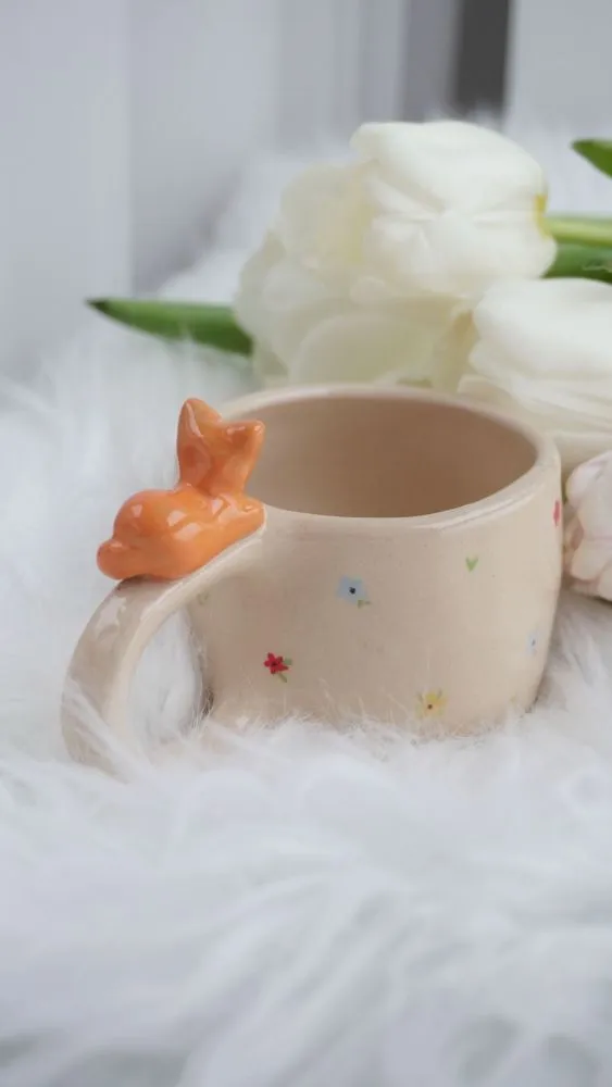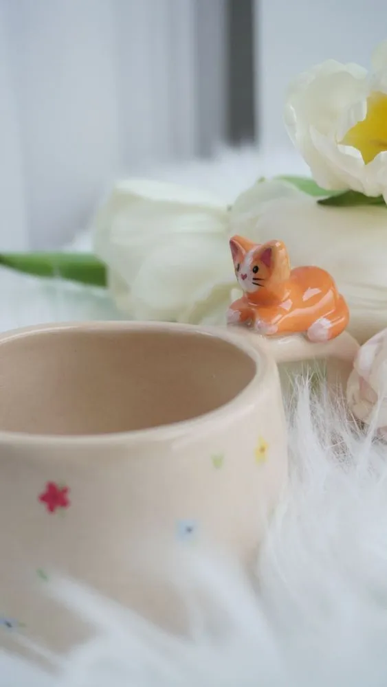 Це керамічне горнятко з руденьким котиком, оточеним квітами, створене для світлих ранків і добрих думок. Котик виглядає так, ніби щойно приліг у квітнику — спокійний, теплий і дуже затишний.