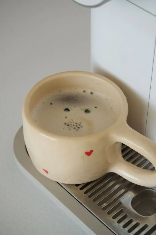 Жабеня ліпиться вручну та ніжно визирає з горнятка, ніби ловить думки й ховає їх між ковтками.