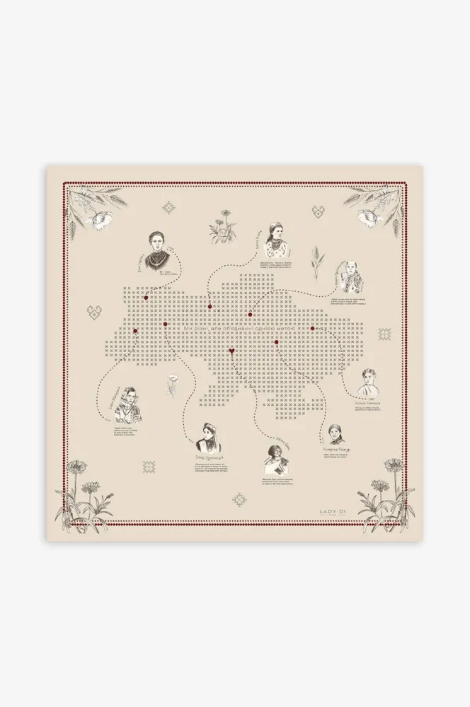 На хустині зображені видатні жінки України: Леся Українка, Соломія Крушельницька, Олена Пчілка, Квітка Цісик, Наталя Полонська, Катерина Білокур,Софія Яблонська, Марія Примаченко.