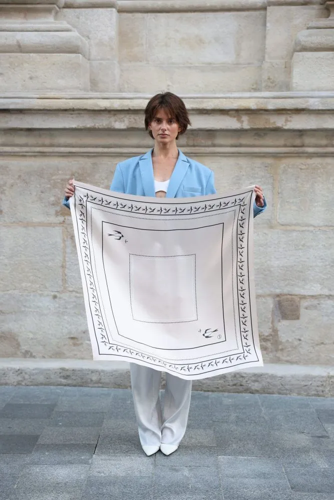 “Я дуже люблю тварин а особливо котів та часто роблю їх персонажами своїх картин,” — розповідає Матвій, автор хустини. Ластівки, які зображені на принті, символізують надію, любов та удачу. Обираючи її, ви наповнюєте свій образ гармонією, нестримною енергією та класикою, яка завжди доречна.