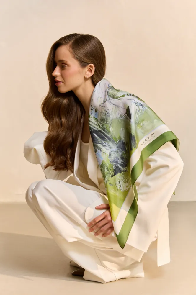 Виготовлена зі штучного шовку преміум-класу, ця хустина стане стильним акцентом у вашому образі, додаючи йому свіжості та легкості.