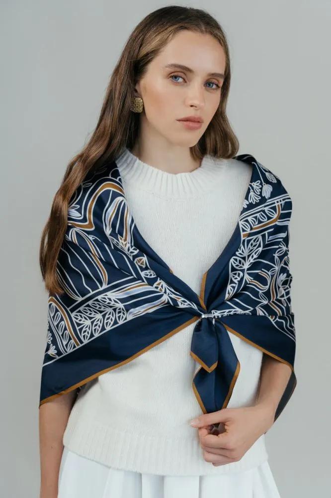 Природа — невід’ємна частина цього великого світового порядку. Колосся і квіти, вплетені у строгі форми, нагадують: навіть у хаосі є ритм, навіть у мінливості є гармонія. Ця хустина — віддзеркалення балансу, на якому тримається краса.