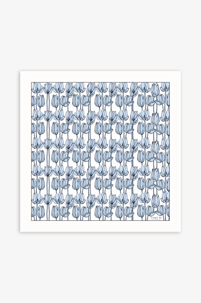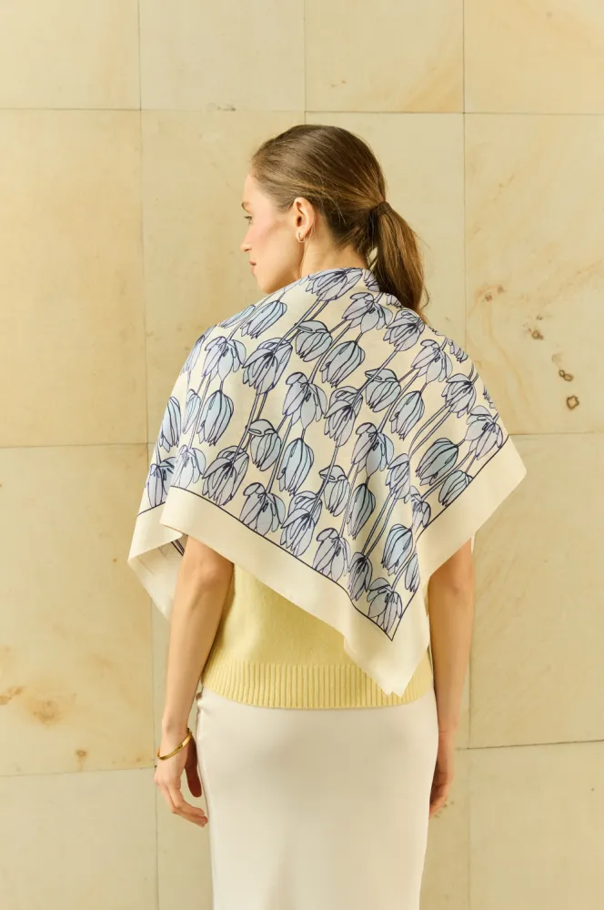 Ця хустина — це прогулянка затишними вулицями Львова, де тюльпани тягнуться до сонця і зливаються з небом. Це досконала симфонія, яка зберігає у своїх лініях подих природи та ритм міста.