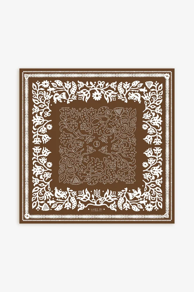 Тут трендові кольори поєднуються із традиційним ремеслом. Через цю хустину ми хочемо познайомити вас із технікою вибійки — створенням орнаментів на тканині за допомогою різьблених форм. Авторка Вікторія надихнулась цим ремеслом, щоб створити свій неповторний взор, що несе сенси. «Основа дизайну — це традиційні українські рослинні орнаменти, створені технікою вибійки: стебла з листочками, квітами, грона винограду, птахи», — каже авторка принта. Його доповнює стилізований герб, як нагадування про дім.