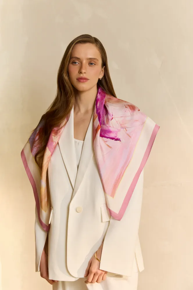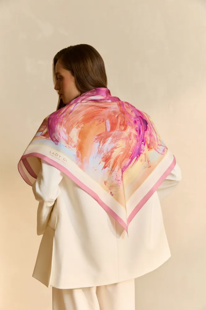 Саме цю магію передає шовкова хустина "Заграва". Вона про перші промені, що пробиваються крізь тишу ночі, про очікування нового, про момент, коли світ ще тільки розгортається, ніби чистий аркуш. Динамічні мазки, створені Андріаною Чухній, нагадують легкий вітер, що жене кольори по небу, сплітаючи їх у танці світла й тіні.