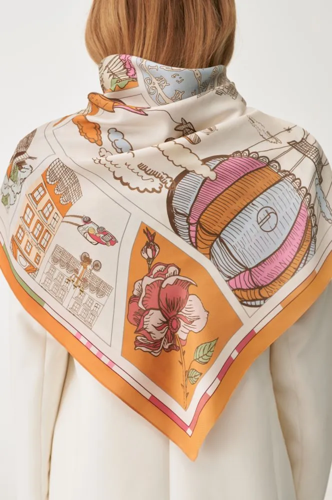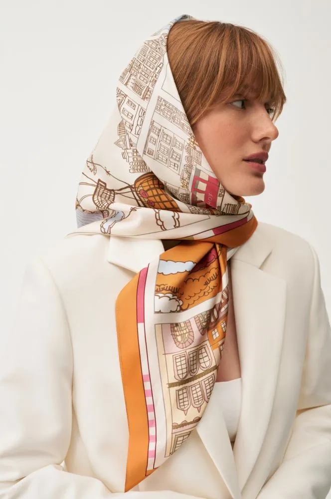 Цю хустину хочеться розглядати довго, відшуковуючи знайомі деталі у колажі з австрійських будиночків, кав’ярень, квітів…