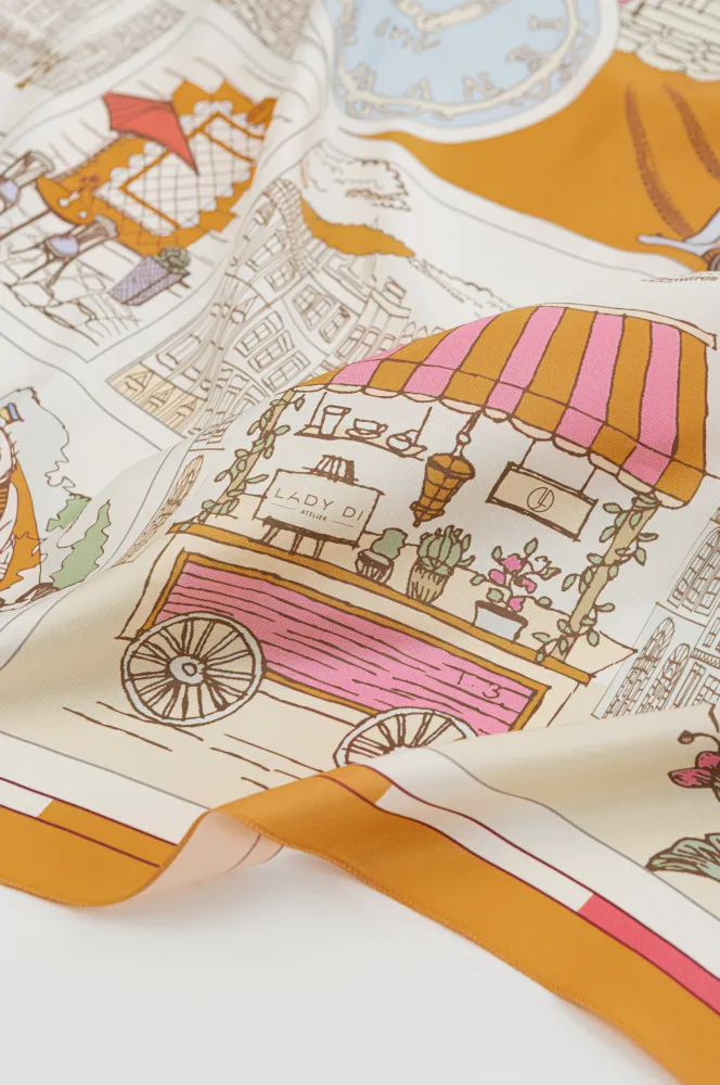 Цю хустину хочеться розглядати довго,  відшуковуючи знайомі деталі у колажі з австрійських будиночків, кав’ярень, квітів…