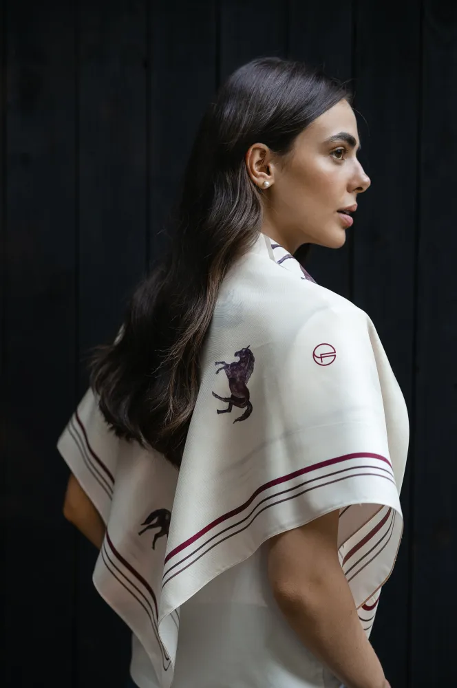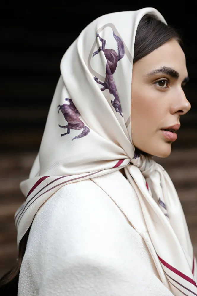 Хустина у класичному стилі, з мʼякими молочно-коричневими тонами. Малюнок на ній про волелюбність — рису, яка близька і нам, визначальна для менталітету українців. Саме таке втілення сили, грації та краси цих тварин намагалася передати авторка малюнку — Марія. У м’якій акварельній техніці їй вдалося відобразити пластику тіла коней у русі та статиці. Композицію принта доповнює естетичний напис “Сила в тобі”, як нагадування про внутрішню опору та красу.