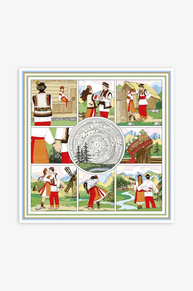 Хустина створена у стилі комікс-арт – колоритна, яскрава, історія кохання гуцульської пари.