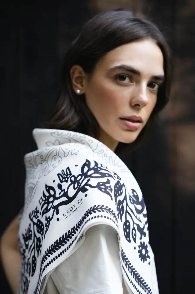 Аксесуар в універсальних кольорах із принтом, натхненним традицією. Він створений за технологією відтворення традиційної вибійки. Це техніка створення орнаментів на тканині за допомогою різьблених форм. У XV столітті місто Кролевець на Сумщині вважалося центром вибійкового мистецтва. А виглядало це так: деревʼяні дощечки чи кліше замочували у фарбу і робили відбиток на тканині.