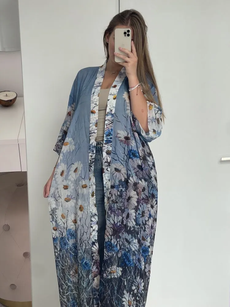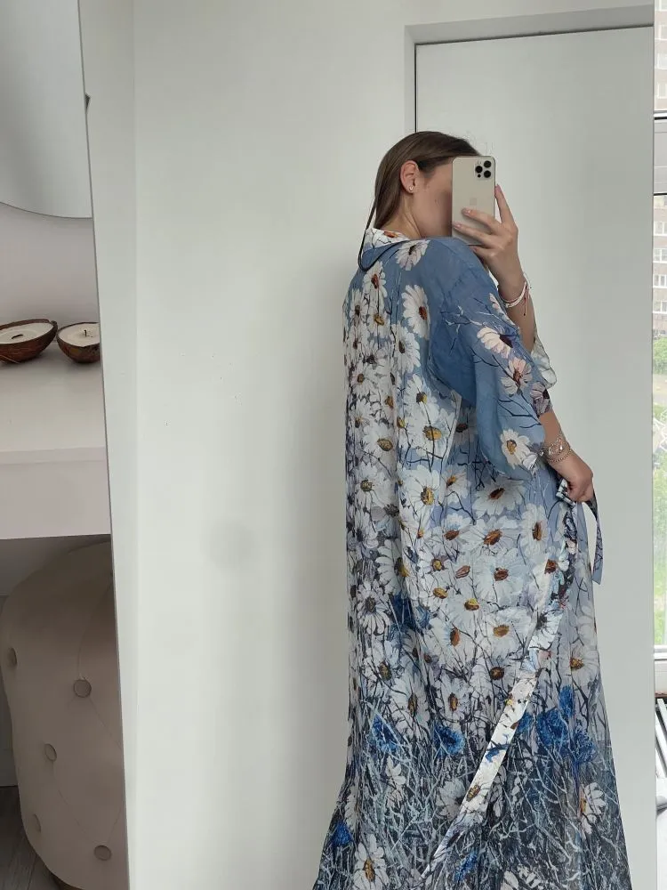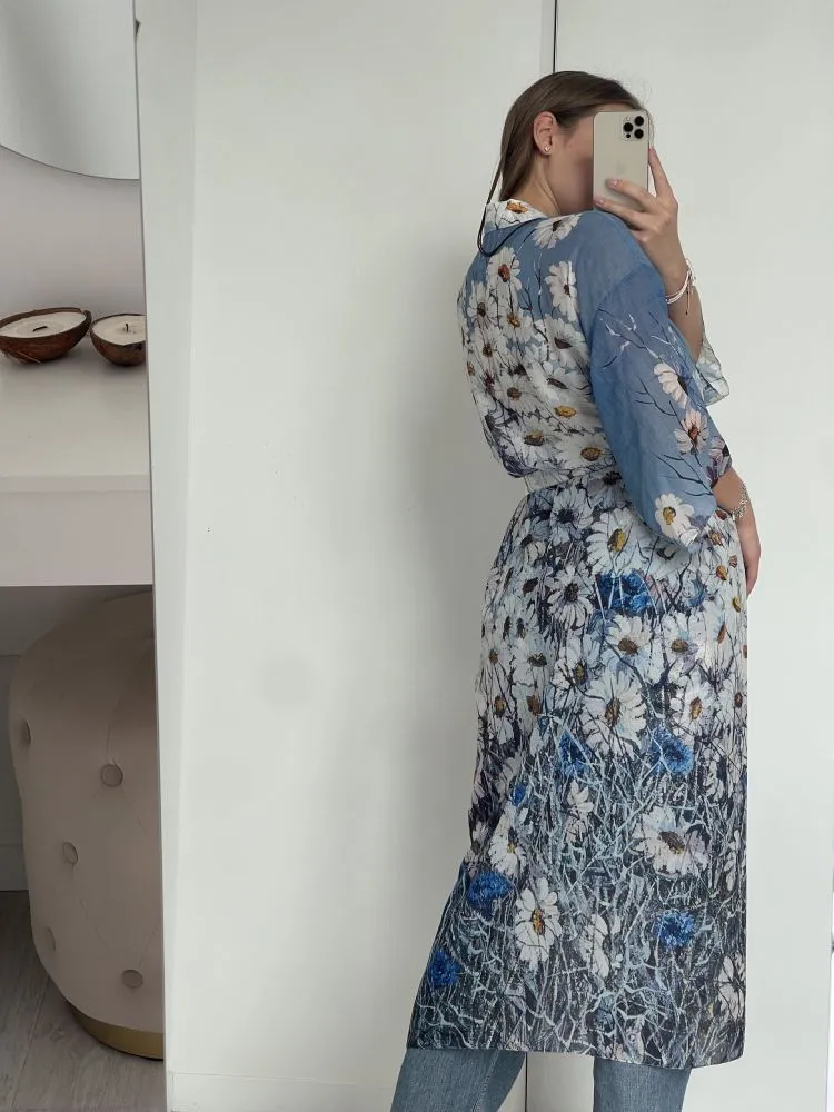 Довге кімоно з делікатного шовку та з унікальним принтом на основі картини української художника Івана Марчука. Виріб має оверсайз крій, прямі широкі рукава та пояс. Для кімоно використано штучний шовк, який м’яко драпірується та дарує ніжні обійми. Виріб легко носити соло або нашаровувати на будь-який одяг - на сукні, топи та брюки для створення невимушених образів. Кімоно підкреслить ваш неперевершений стиль та запам‘ятається яскравим малюнком на тлі глибокого синього кольору.