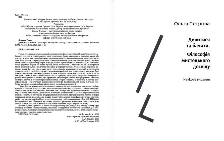 "Дивитися та бачити. Філософія мистецького досвіду" — це унікальна книга про те, як мислить художник і що насправді відбувається у творчому процесі. Авторка, відома художниця, докторка філософських наук Ольга Петрова, відкриває читачеві двері до майстерні митця та показує, як народжується образ, ідея, візуальна метафора.