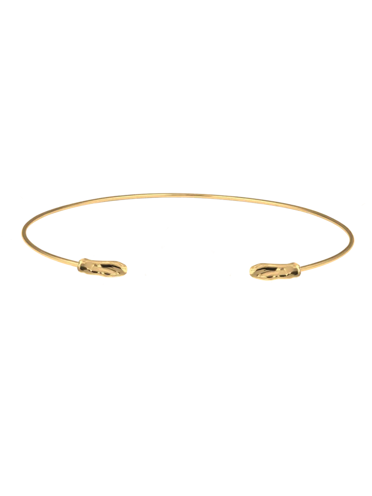 Кольє на жорсткій основі, виконане зі срібла та вкрите шаром стійкої позолоти. Кольє доповнене двома срібними елементами (зліпки зі справжньої перлин) вкритими позолотою.