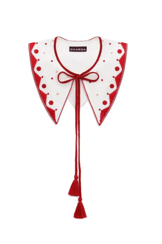 Аксесуар молочного кольору, прикрашений червоними зірками. Комірець зав’язується спереду китицями та стане чудовим акцентом для зимових образів та особливих моментів.