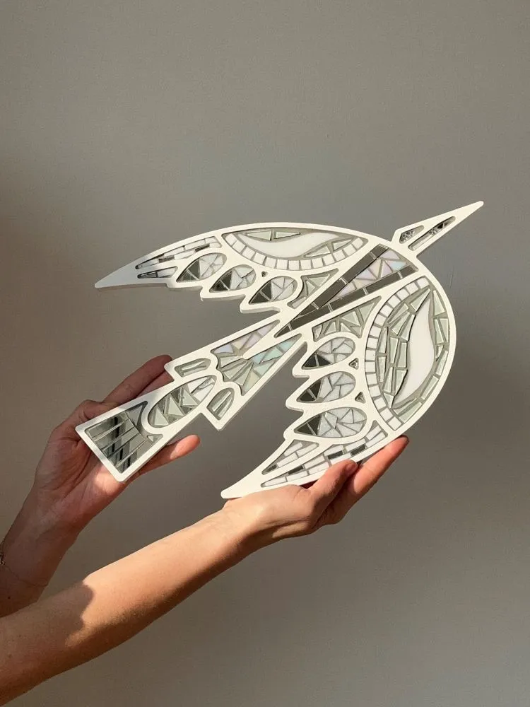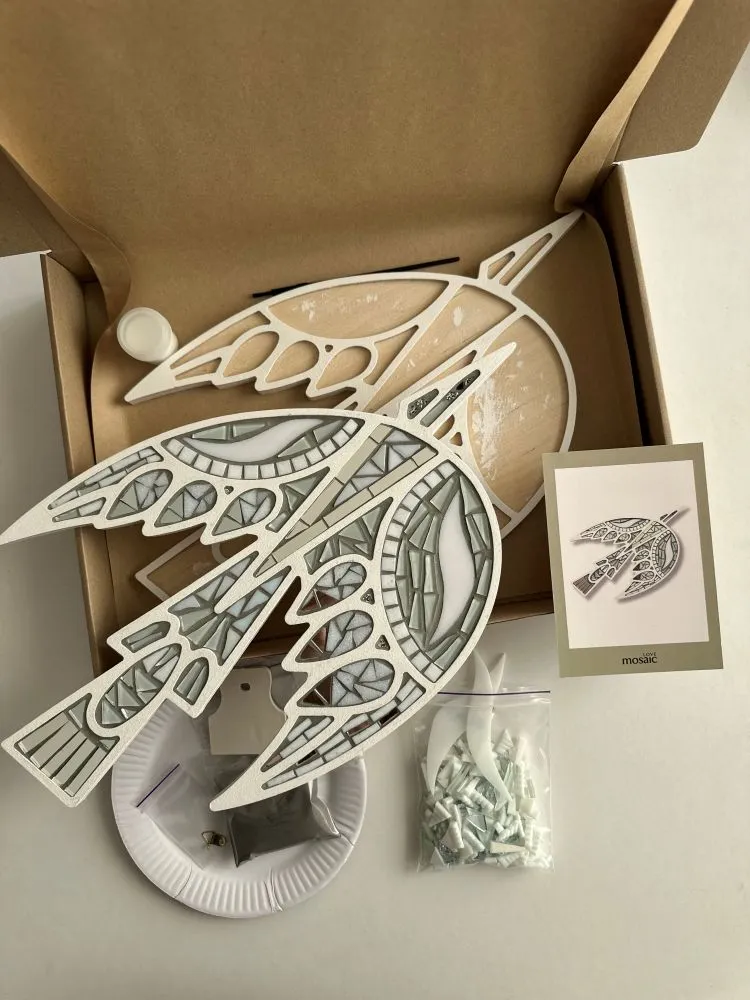фігурна основа з фанери 1 шт., нарізана кольорова мозаїка 250 г., фуга 90 г., настінний елемент кріплення 1 шт., клей ПВА 40 мл, пензлик для клею, гумовий шпатель, інструкція українською та англійською мовами.