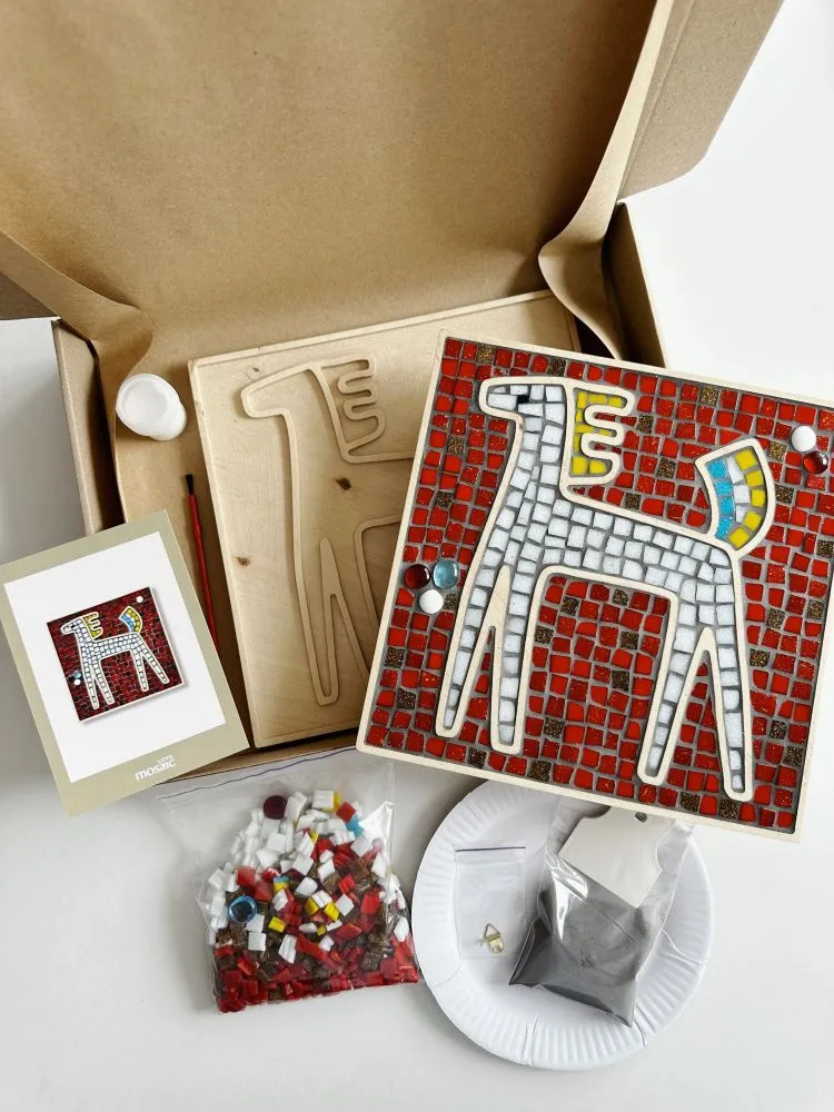 фігурна основа з фанери — 1 шт., нарізана кольорова мозаїка 335 г, фуга 100 г, настінний елемент кріплення 1 шт., клей ПВА 40 мл, пензлик для клею, гумовий шпатель, інструкція українською та англійською мовами.