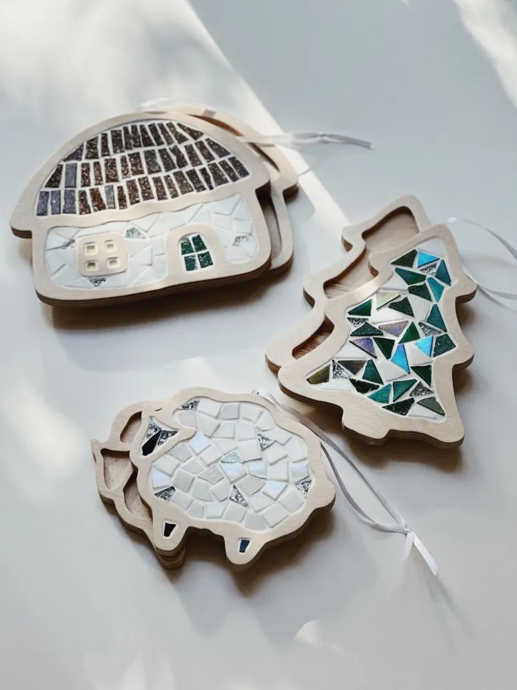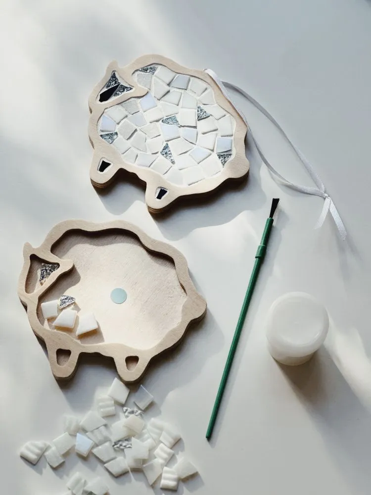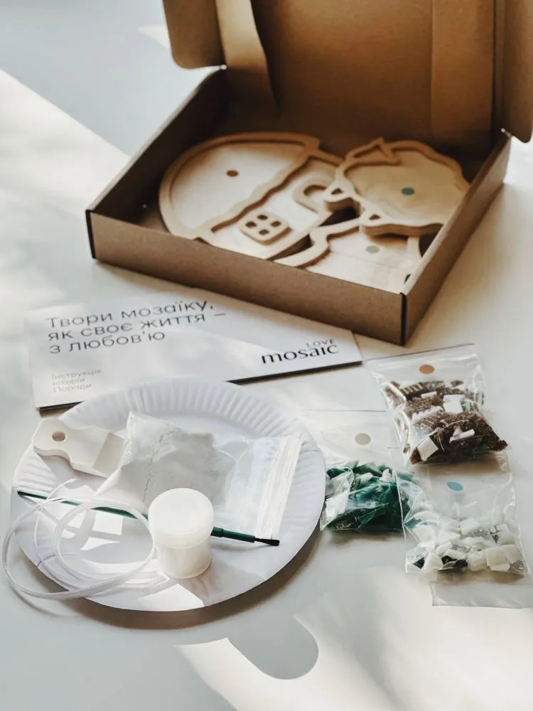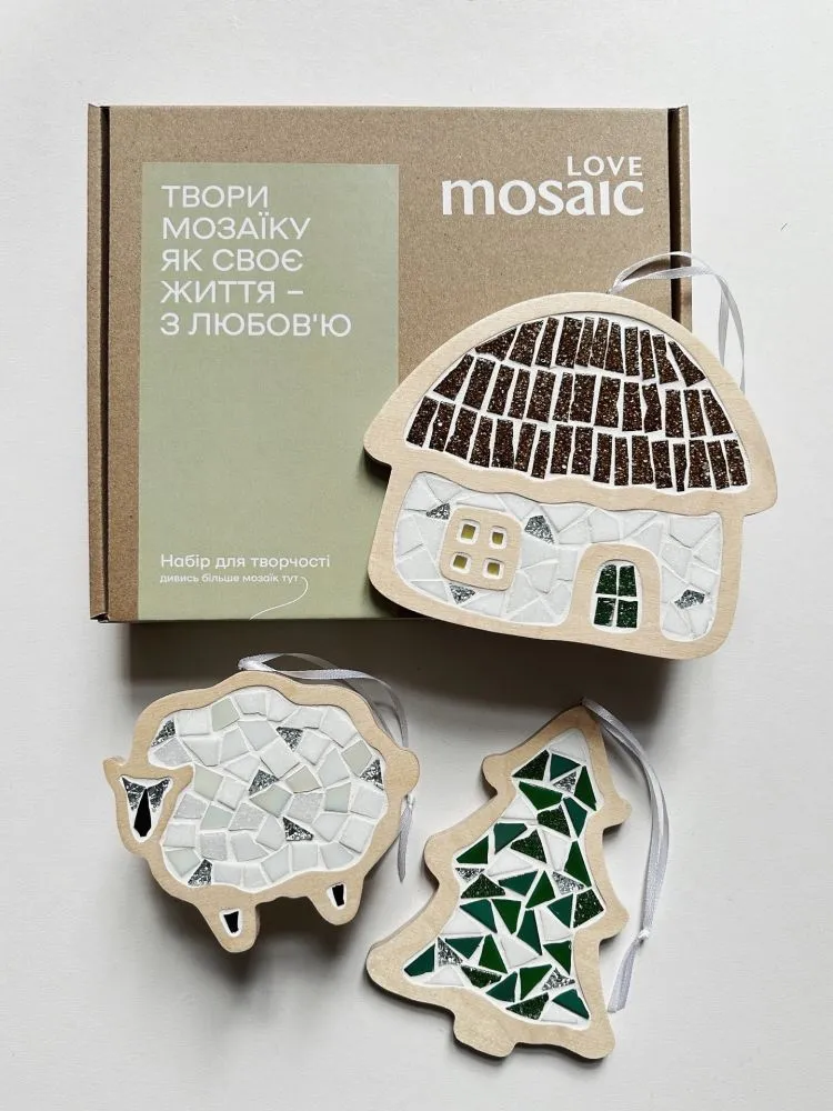 Вміст: фігурна основа з фанери - 3 шт., нарізана кольорова мозаїка 100 г, фуга 60 г, стічка 3 шт., клей ПВА 40 мл, пензлик для клею, гумовий шпатель, інструкція українською та англійською мовами, листівка з прикладом.
