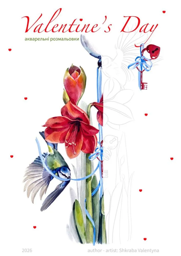 8 розмальовок А4 розміру на акварельному папері 8 листівок (аб формату на папері 350 грам) 4 дот-карти (професійні акварельні фарби) 1 пензлик (професійний)