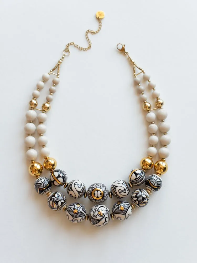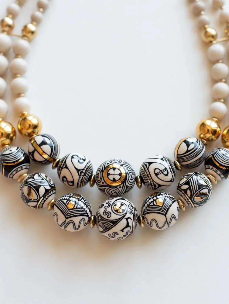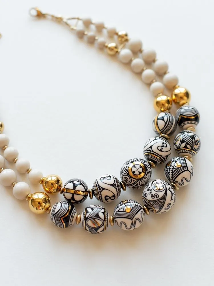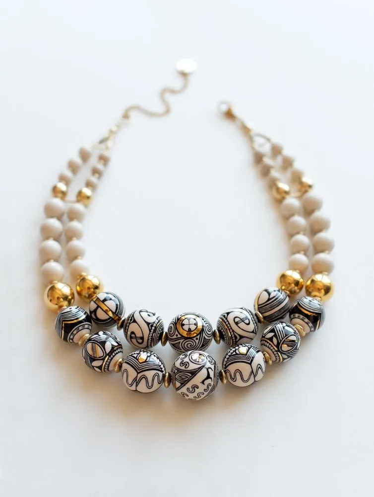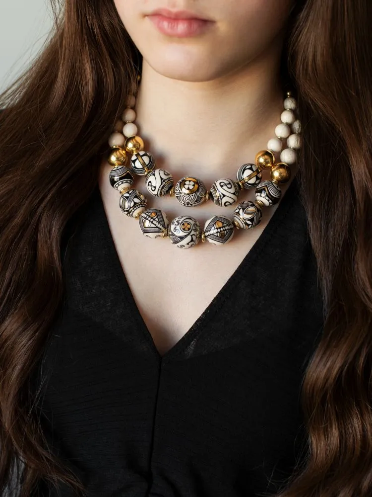 Це намисто народжене з памʼяті землі. У його орнаменті — антропоморфні знаки Трипілля, символи жіночої сили, сонця, родючості та безперервності життя. «Берегиня Роду» — про внутрішню силу жінки, її звʼязок із родом та землею. Це прикраса-оберіг, що несе в собі дує предків і сучасну витонченість.