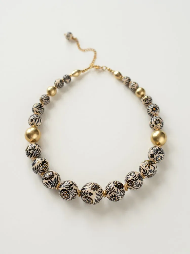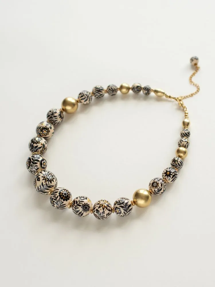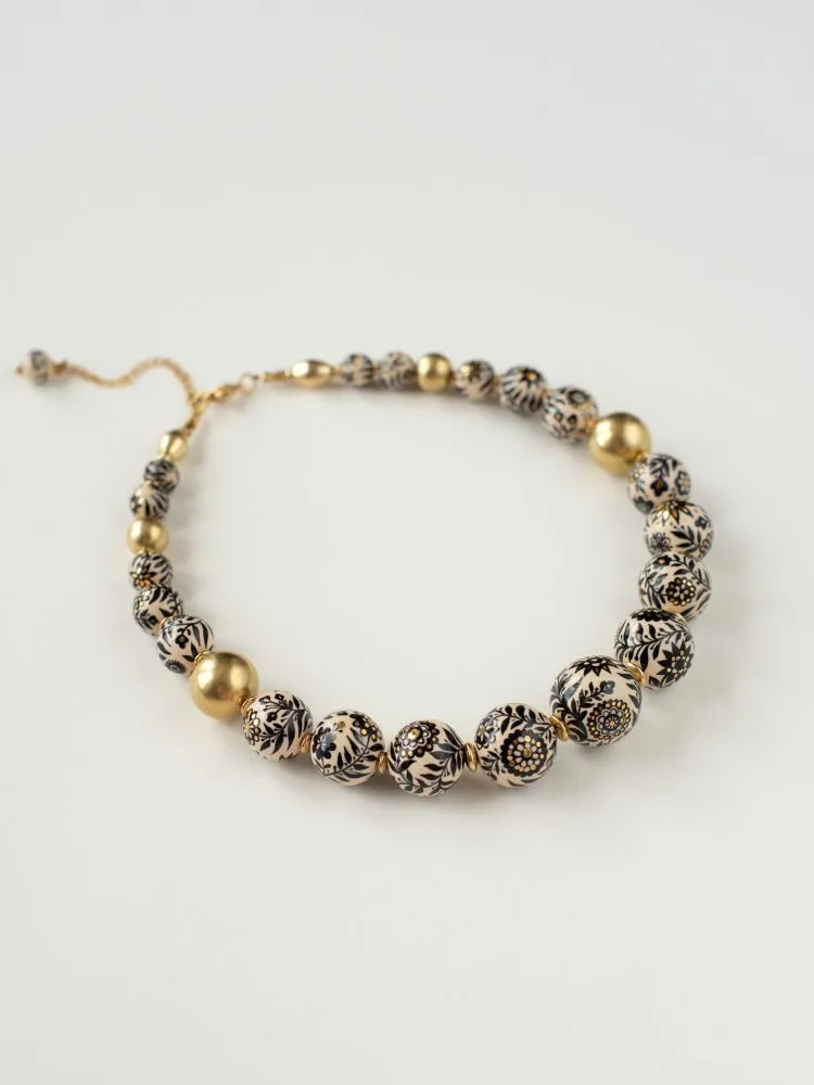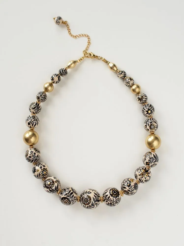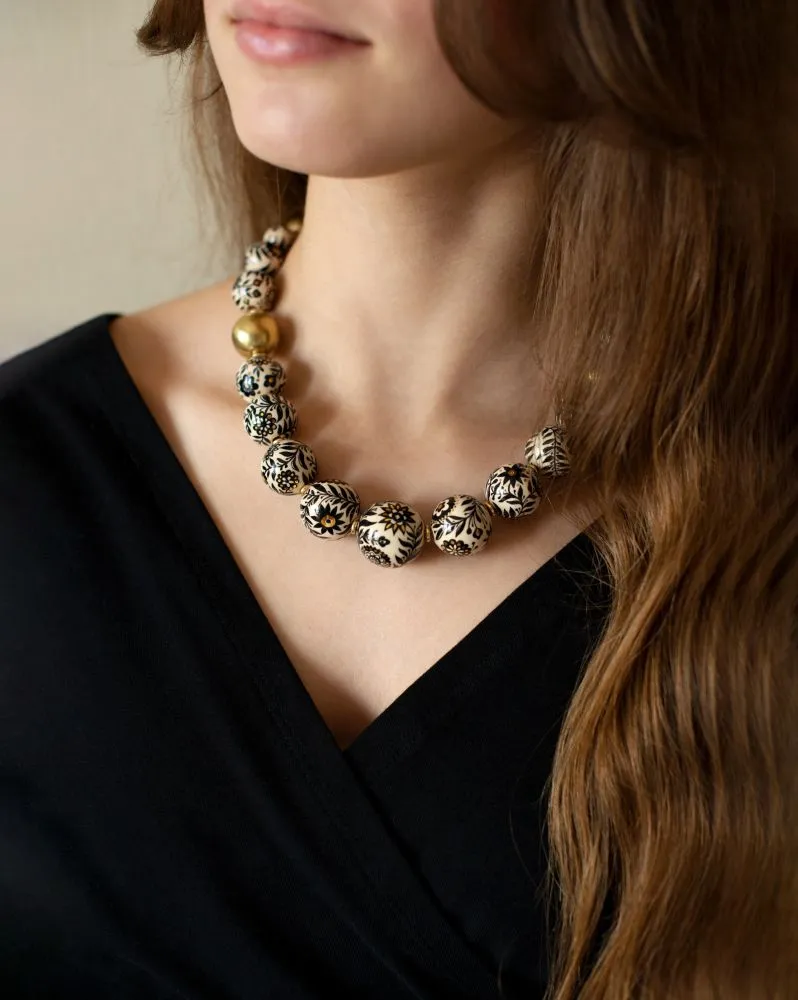 Намисто виконане з авторських пустотілих керамічних намистин з підглазурним розписом та надглазуррим розписом рідким препаратом золота 10%, намистин та фурнітури з латуні. Довжина низки з врахуванням застібки - 48,5 см. Розмір намистин від 2,5 до 1,2 см.