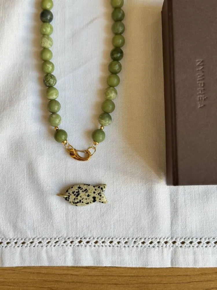 Матеріал: зелений Нефрит, рибка з далматинової Яшми.
