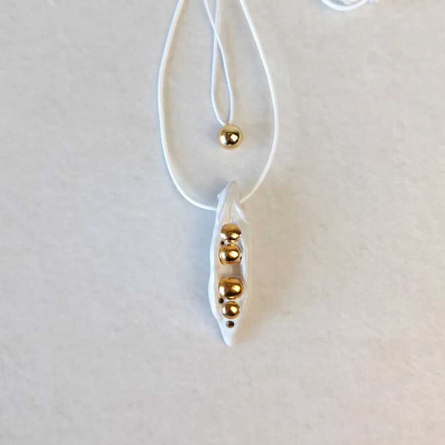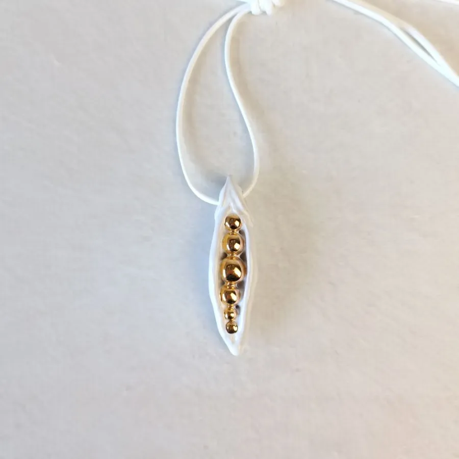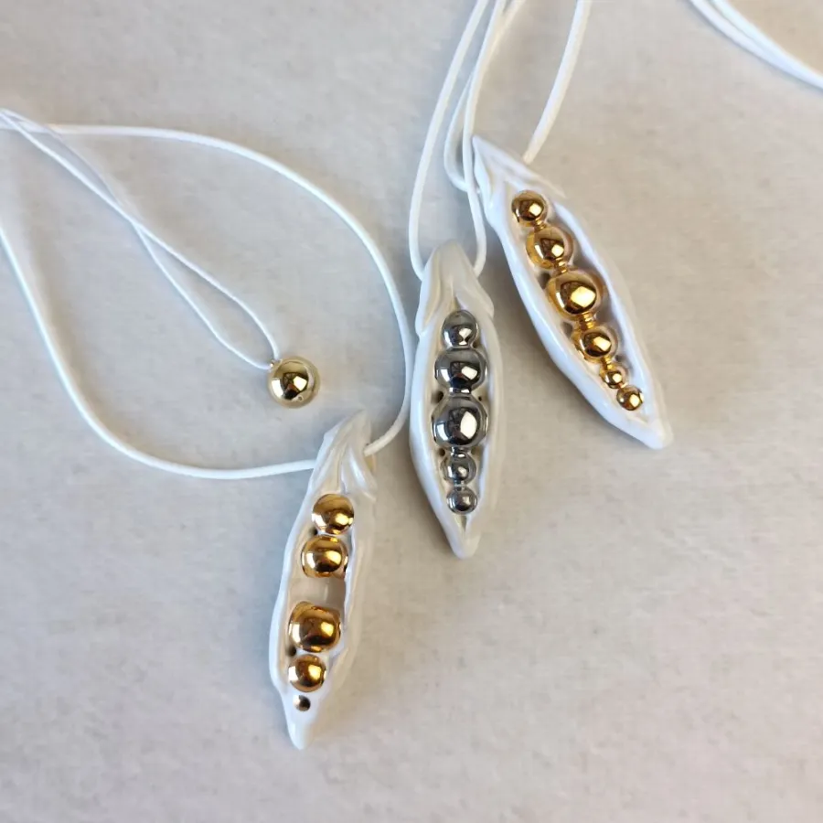 Кожен кулон — це тонка ручна робота, де гладкі керамічні «горошини» затишно причаїлися у відкритому стручку. Витончений акцент, який додає образу природної свіжості та особливого змісту.