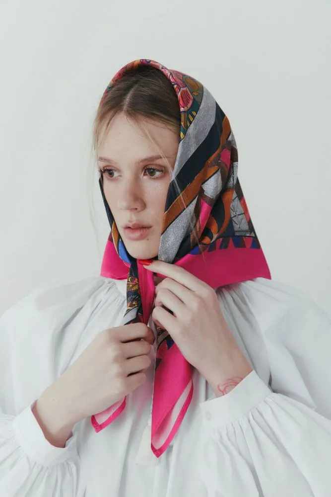 Хустка “Повернувся модерністом” представлена у двох розмірах: S (52×52), L (82×82).