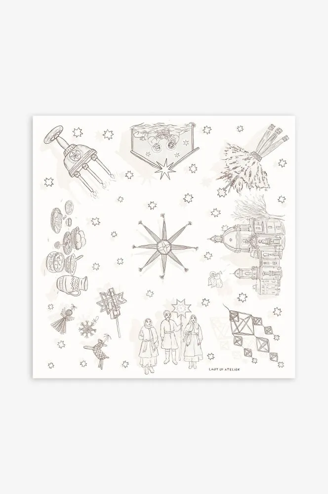 У теплій бежевій гамі поєднано храм і янголів, вертеп і обрядову зірку, козу і дідух, свічник-трійцю та Святу вечерю — символи, що роблять наші традиції впізнаваними й неповторними.