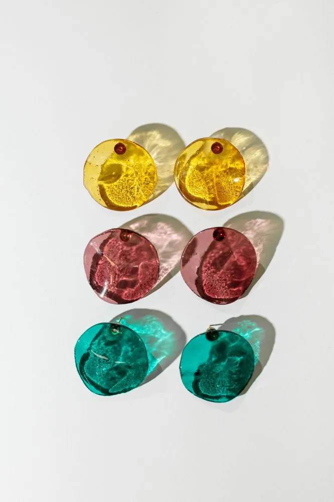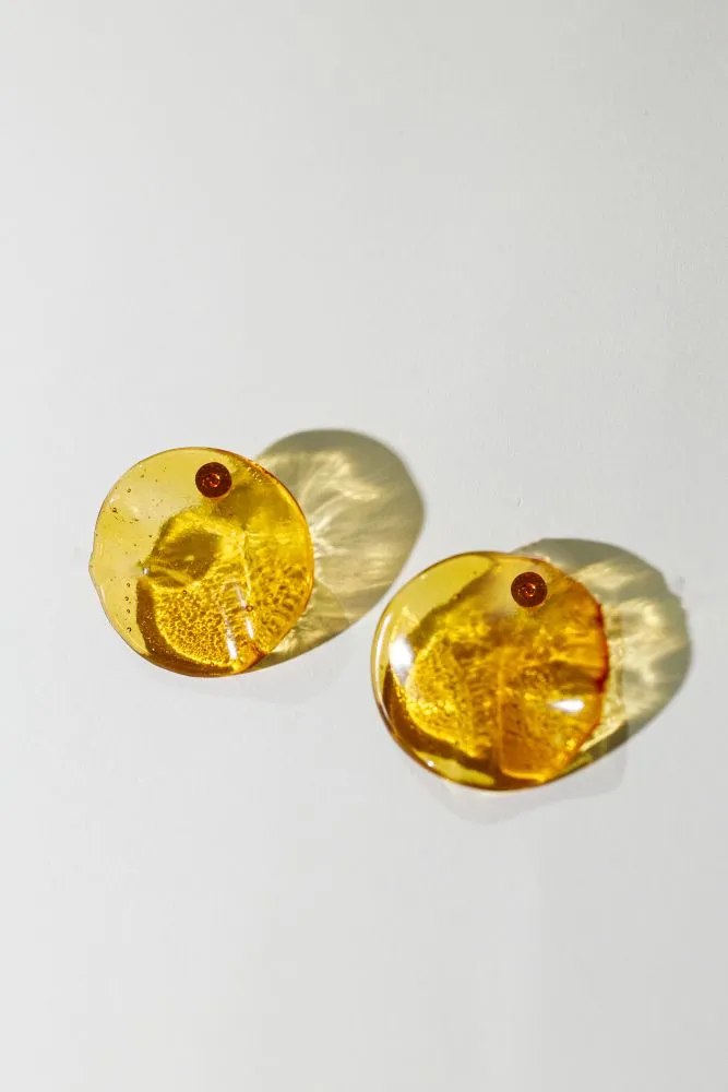 Сережки виготовлені вручну зі скла, створені методом випікання у печі. Кожен елемент має унікальну форму та текстуру.