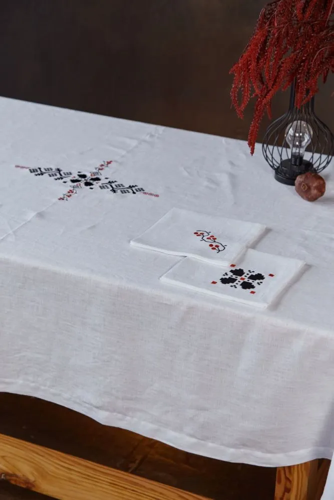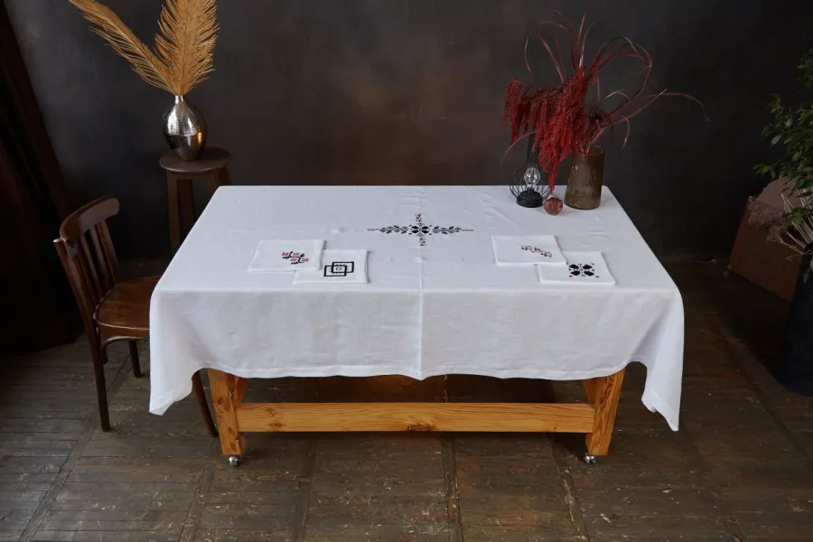 Вишивка "Український орнамент" поєднує у собі традиційні взори із різних регіонів України та із різних виробів. За цим ранером стоїть довга пошукова робота дизайнерки бренду та її творче бачення. Бо це не відтворення однієї давньої вишивки із збережених зразків, а органічне поєднання різних орнаментів у символічну форму Хреста, що означає перемогу світла над пітьмою та гармонію чотирьох стихій.