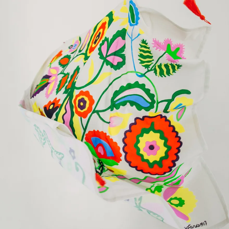 Скатертина «В’юнок» — про силу квітнути попри все. Створена за мотивами однойменної картини майстрині декоративного розпису Ганни Собачко-Шостак, це не просто предмет побуту, а творча спроба заговорити мовою квітів та надати їм життєствердного символізму.